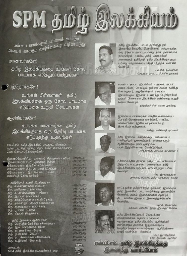 மேலும், 2005க்கு முன்னர் வரை இருந்த தமிழ்த்தேர்வுத்தாட்கள் மொழியால் தமிழில் இருந்தாலும் உள்ளடக்கத்தால் அதிகமும் பொதுவான செய்திகளையும் தகவல்களையும் கொண்டதாகவே இருந்தது. அதனையும் 70 விழுக்காடு தமிழ்ப் பண்பாடு சார்ந்ததாகவும் 30 விழுக்காடு மலேசியா, பொதுத்தன்மை கொண்டதாகவும் மாற்றியமைத்தார். அந்த 70 விழுக்காடு கேள்விகளின் உள்ளடக்கத்திலும் தமிழறிஞர்கள் குறித்த கேள்விகள் இடம்பெறும் என்ற அறிவிப்பும் வெளியீடப்பட்டது. அவ்வாறாகத்தான், தமிழுக்குப் பாடாற்றிய உ. வே. சாமிநாதய்யர், கி. ஆ. பெ விசுவநாதம், மலேசியத் தமிழறிஞர்கள் அ. பு. திருமாலனார் போன்றோர் மாணவர்களுக்கு அறிமுகப்படுத்தப்பட்டனர்.