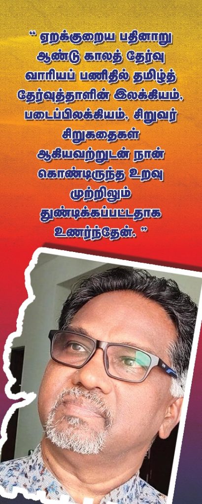 அரை நூற்றாண்டுக்கும் மேலாக தமிழ் இலக்கியப் பாடம் மலேசியக் கல்விச் சூழலில் இயங்கி வருகிறது. ஒரு பாடம் கல்வி அமைச்சில் தேர்வுப் பாடமாக அல்லது கற்றல் கற்பித்தலுக்கு உட்பட்டிருக்க வேண்டுமென்றால் அப்பாடத்தை எடுத்து படிக்கும் மாணவர்களின் எண்ணிக்கையைப் பொருத்துதான் நிகழ்கிறது. நாடு தழுவிய நிலையில் அப்பாடத்தை எடுத்துப் படிக்கும் மாணவர்கள் குறைந்த பட்சம் குறிப்பிட்ட ஓர் எண்ணிக்கையைக் கொண்டிருக்க வேண்டும். இல்லையென்றால் அப்பாடமானது கல்வி அமைச்சின் பாடப் பட்டியலிலிருந்து நீக்கப்படும்.