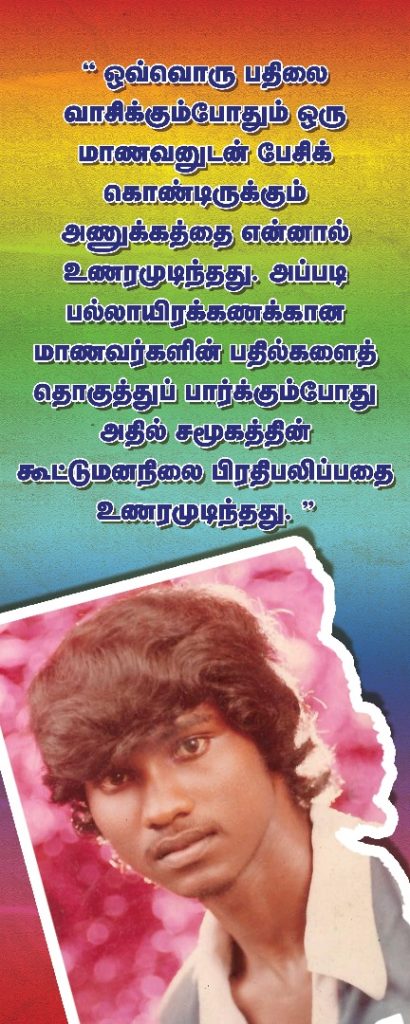 வெறும் முன்னூறாக இருந்த தமிழ் இலக்கியப் பாடம் எடுக்கும் மாணவர்களின் எண்ணிக்கையை மூவாயிரமாக மாற்ற வேண்டும் என்ற எண்ணத்தை ஆழமாகத் தன்னுள் விதைத்துக் கொண்டு பணிச் சூழல்களுக்கிடையே இது தொடர்பான களப்பணிகளும் ஆற்றத் தொடங்கினார். பணி நிமித்தமாக தமிழ்ப்பள்ளி மற்றும் இடைநிலைப்பள்ளி ஆசிரியர்களைச் சந்திக்கும் வாய்ப்புக் கிடைத்த தருணங்களிலெல்லாம் இலக்கியப் பாடம் தொடர்பான விழிப்புணர்வை விதைக்கத் தொடங்கினார். இந்த நாட்டில் இலக்கியப் பாடத்தின் எதிர்கால நிலையைக் கண்முன் நிறுத்தி ஆசிரியர்களுக்குள் சிந்தனை எழுச்சியை ஏற்படுத்தினார். இந்தக் காலக்கட்டதில்தான் மூர்த்தி அவர்களின் தொடர்பும் எனக்குக் கிடைத்தது. என் சிறுகதைகளே அவரை எனக்கு அறிமுகப்படுத்தியது.
